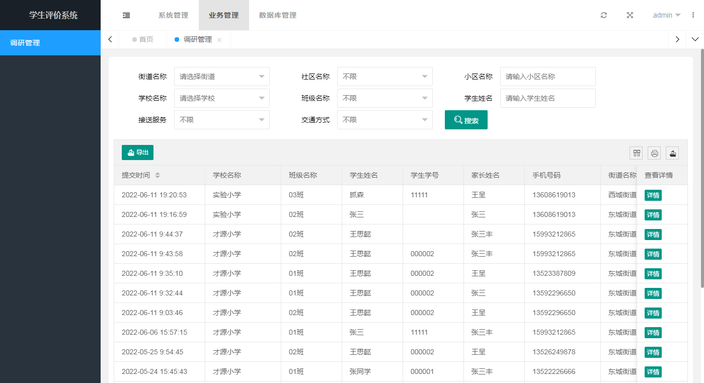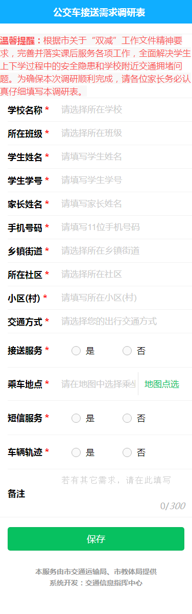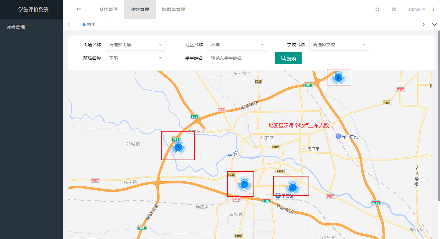客戶定制的學生公交乘車調(diào)研系統(tǒng),實現(xiàn)用戶前臺填寫公交乘車要求,后臺匯總統(tǒng)計,并在地圖上呈現(xiàn)每個乘車人員分布區(qū)域。