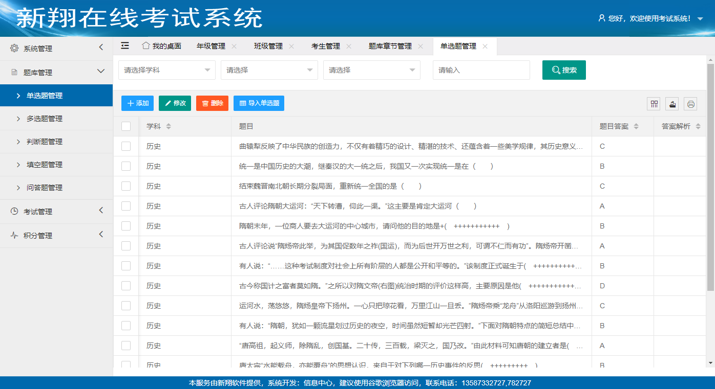 3、題庫管理功能:可增加或導入單選、多選、判斷、填空、問答等各種題型。